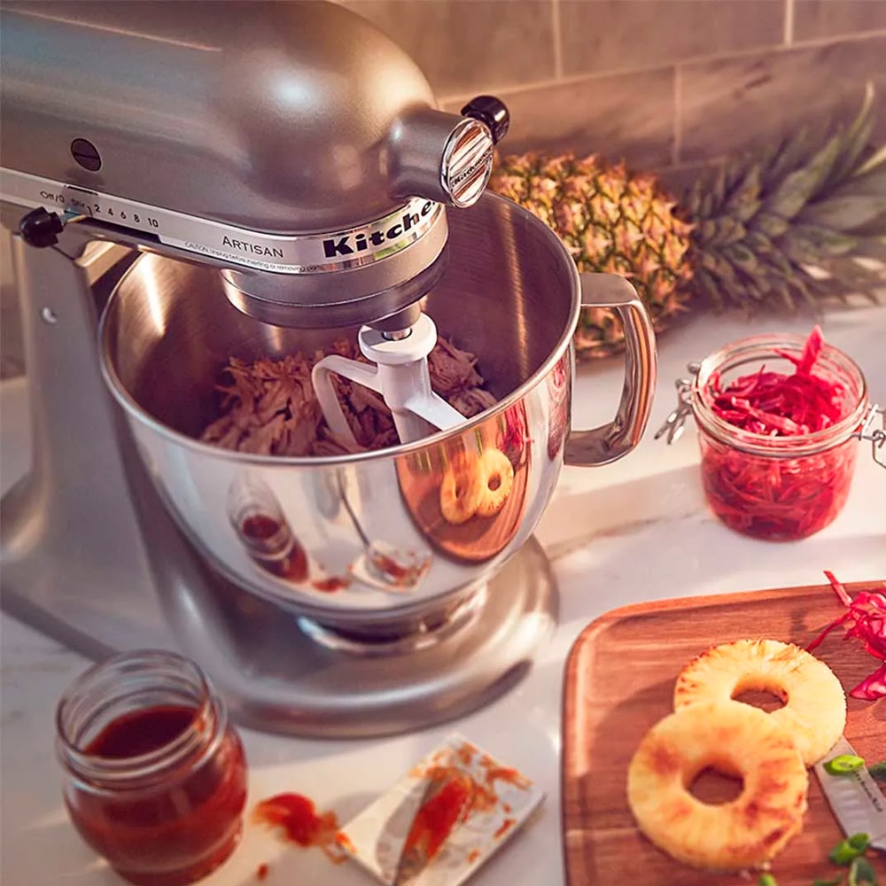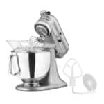 La Batidora Artisan de KitchenAid tiene el tamaño perfecto para 9 tazas de harina, incluye los accesorios básicos que necesitas para tener éxito en la cocina: Tazón mezclador, Batidor plano, Batidor de alambre y Gancho para masa. Todas las batidoras cuentan con un centro de conexión de aditamentos para convertir tu batidora en un centro culinario, podrás crear todas las recetas que puedas imaginar gracias a sus múltiples usos con una acción planetaria de 59 puntos de contacto lo que brinda un batido perfecto para que tus platillos tengan un resultado profesional y delicioso.