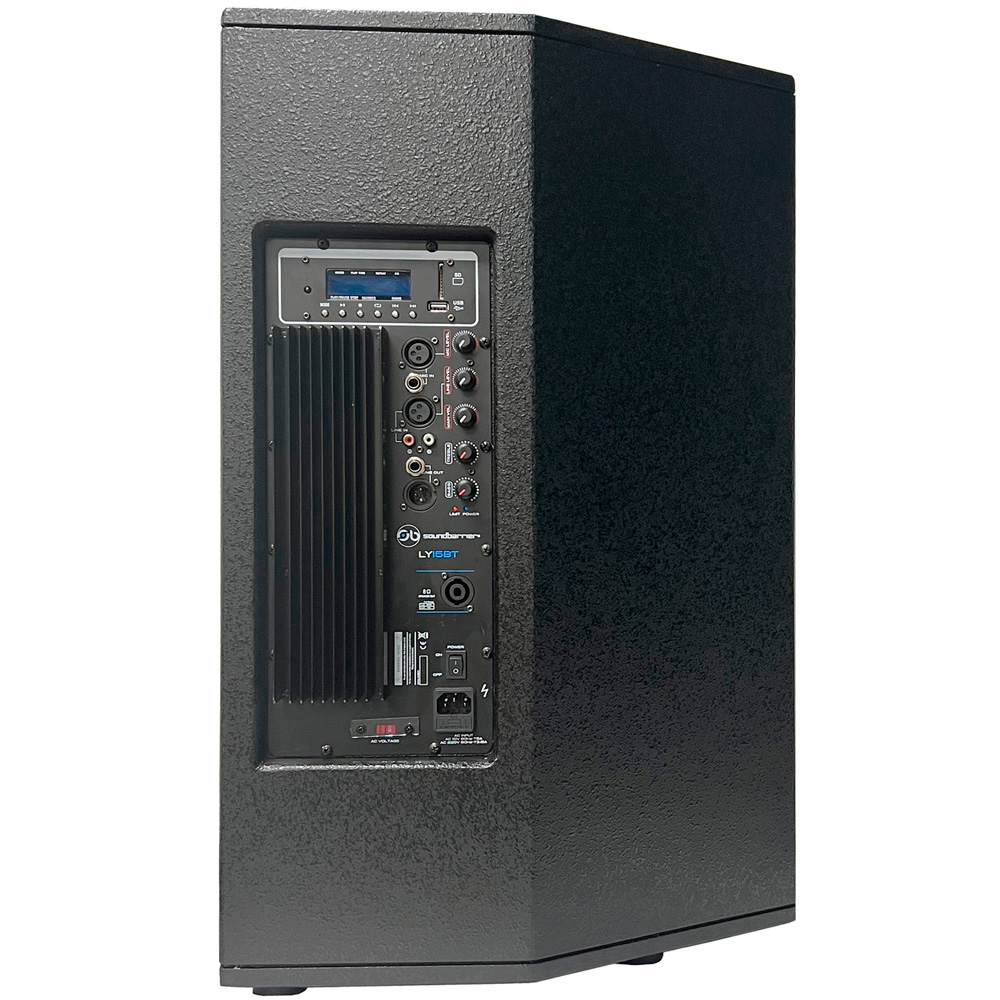 El altavoz multifunción LY15BT de 15″ incluye tecnología inalámbrica SBT, un reproductor multimedia digital integrado con entradas de memoria flash USB/SD y radio FM. Estas funciones son accesibles a través del reproductor multimedia digital integrado, que cuenta con 6 botones y una pantalla LCD azul en el panel trasero.