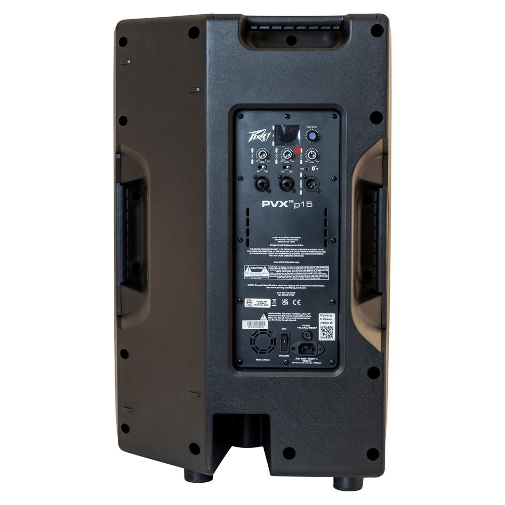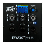 El PVXp 15 Bluetooth cuenta con una fiable sección de potencia biamplificada que proporciona un total de 980 vatios de potencia dinámica máxima con compresión y limitación basadas en DSP. Esta caja incluye un woofer robusto de 15″ con una bobina de voz de 2 3/8″ e imán de 50 onzas, y un motor de compresión RX14 con un diafragma de titanio de 1,4″ sobre una bocina asimétrica con patrón horizontal de 100° y vertical de 50°. El PVXp 15 Bluetooth ofrece dos canales con una entrada balanceada mediante un conector combinado que acepta una entrada TRS balanceada de 1/4″ y una entrada XLR balanceada. Incluye un interruptor para cambiar entre la ganancia de línea y la de micrófono. Un tercer canal se utiliza para una fuente Bluetooth o, alternativamente, para una entrada auxiliar de 1/8″. Cada canal cuenta con un control de nivel ajustable y una sección de ecualización de tres bandas. Dispone de una salida balanceada, un XLR macho, que permite enviar las señales mezcladas de los tres canales a otro componente. El indicador LED del deflector frontal se puede configurar para que se ilumine al encender el equipo y al activarse el circuito DDT de “limitación suave”, o bien, se puede desactivar por completo. La pantalla LCD, los preajustes del ecualizador y otros parámetros operativos del DSP se acceden mediante un selector de un solo botón.