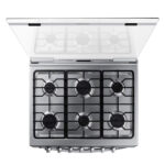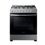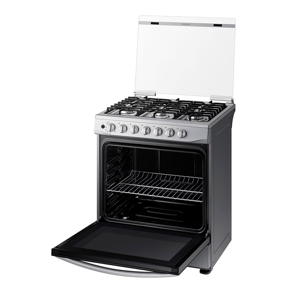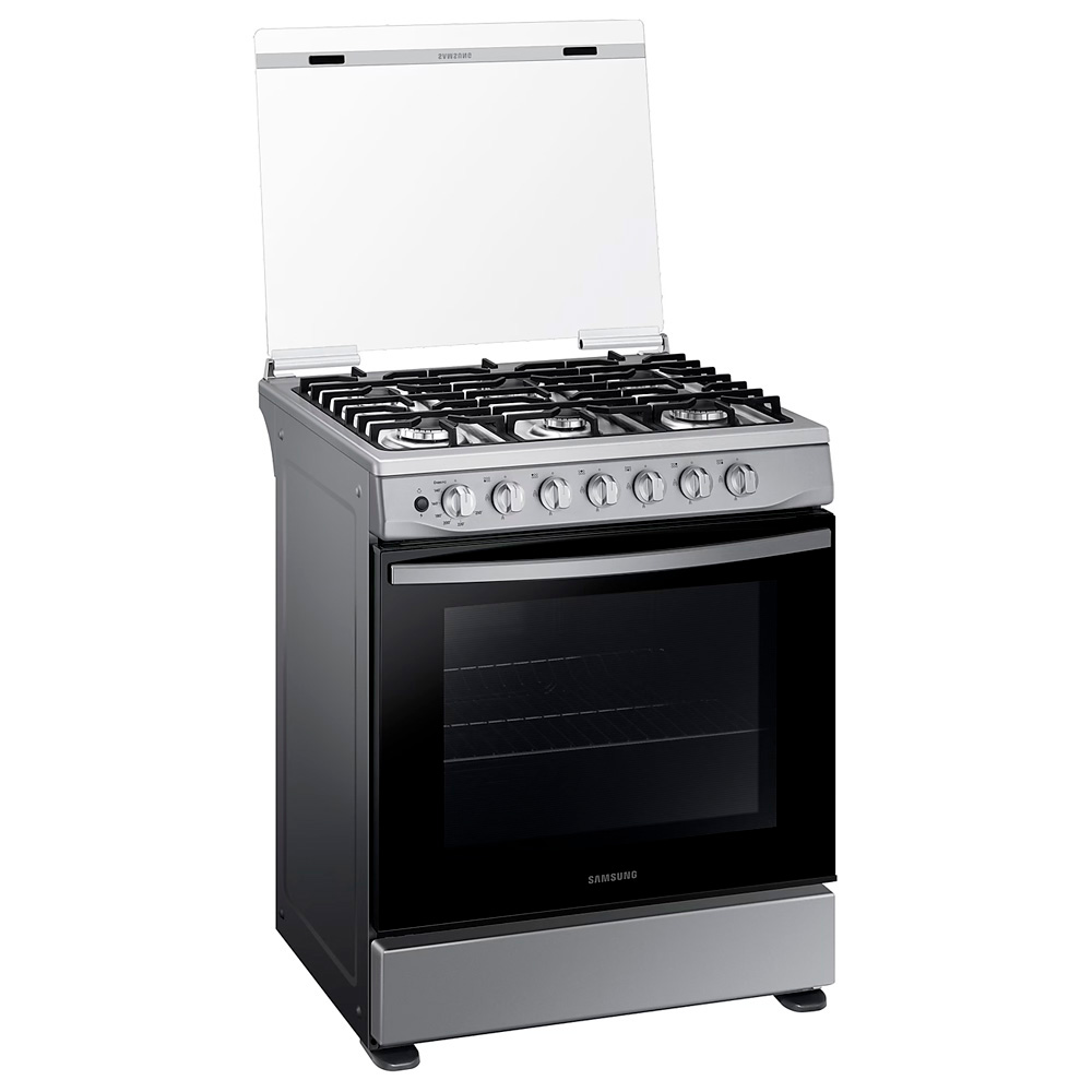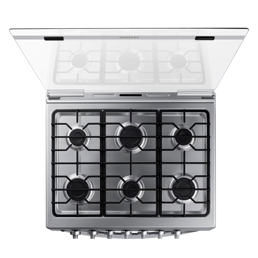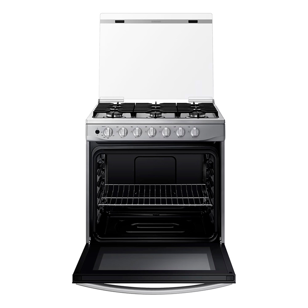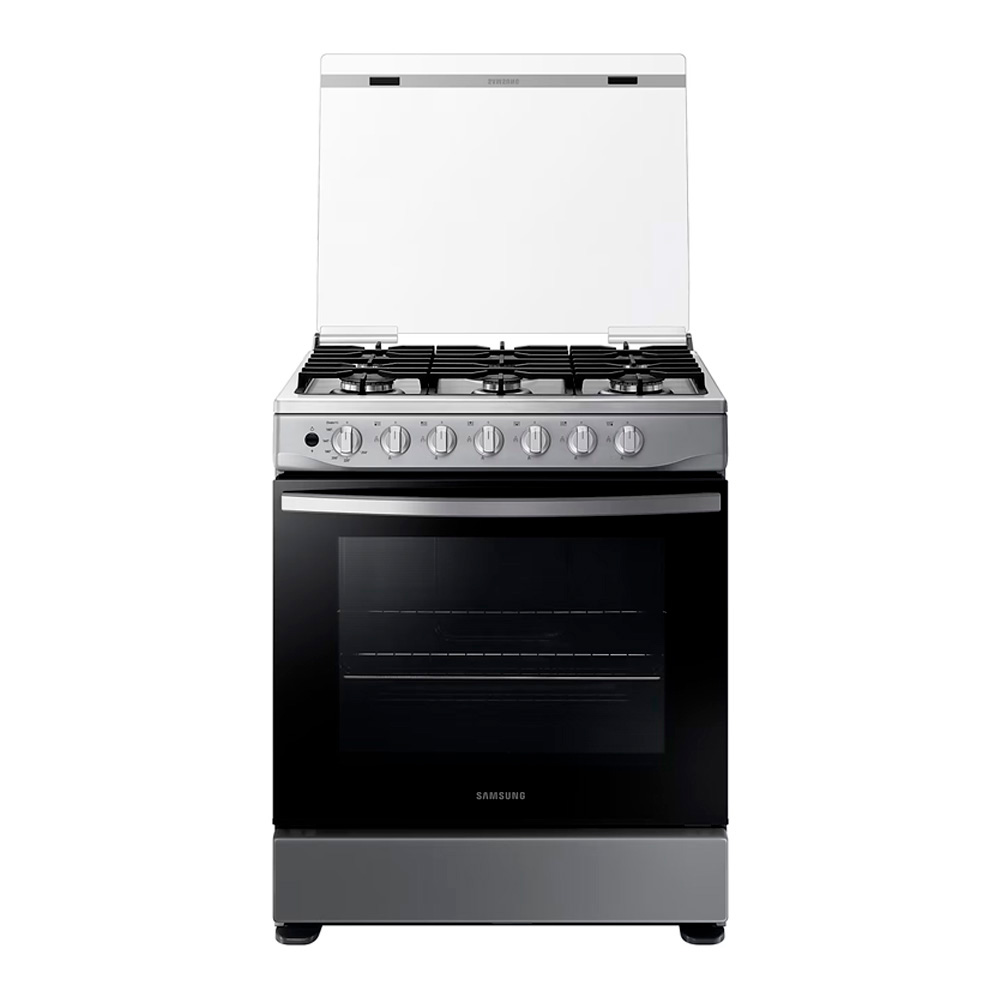 La estufa a gas Samsung NX52T7322LS/AP de 30 pulgadas combina potencia y diseño moderno con acabados en acero inoxidable. Cuenta con cinco quemadores sellados de alta eficiencia, incluyendo un quemador central Triple Power de 11,260 BTU, ideal para una cocción rápida y uniforme. Su horno de 5.2 pies cúbicos ofrece gran capacidad y elementos ocultos para facilitar la limpieza. Además, dispone de parrillas de hierro fundido, encendido eléctrico de dos pasos y controles ergonómicos, todo en un diseño elegante que se adapta a cualquier cocina.