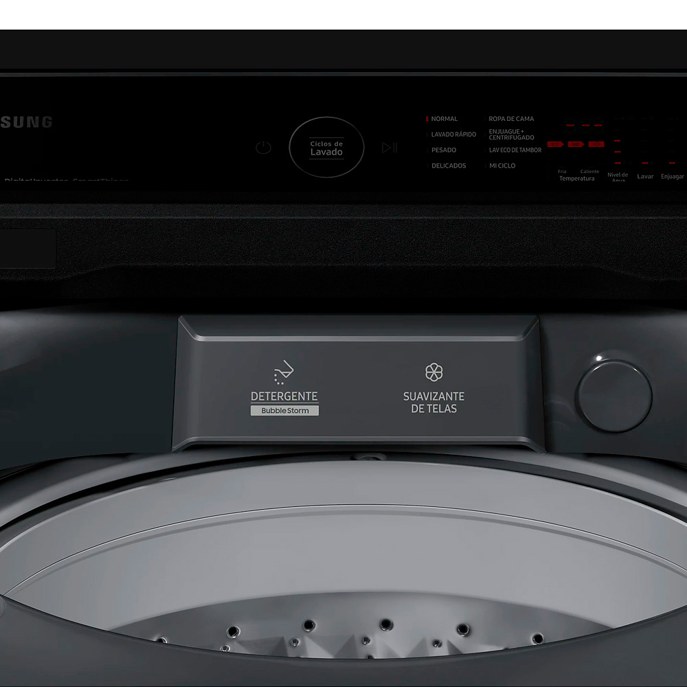 La Samsung Lavadora de Carga Superior 19 kg combina potencia y tecnología avanzada para un lavado más eficiente y cuidadoso con tus prendas. Incorpora Eco Bubble™, BubbleStorm™ y Dual Storm™, que generan burbujas y corrientes de agua potentes para eliminar la suciedad sin dañar la tela. Su motor Digital Inverter (DIT) ofrece mayor durabilidad y eficiencia energética, mientras que funciones como Smart Check, reinicio automático, bloqueo para niños y cierre suave de tapa (Soft Close Lid) brindan comodidad y seguridad. Con 10 niveles de agua y múltiples programas especializados como ropa de cama, delicados, lavado rápido, super clean y limpieza ecológica de tambor, se adapta a cualquier necesidad de lavado. Su diseño moderno en blanco con puerta negro caviar y panel LED intuitivo, junto con el Magic Filter y una capacidad de 19 kg con centrifugado de 700 rpm, la convierten en la opción ideal para familias que buscan gran capacidad, cuidado de la ropa y ahorro de energía.