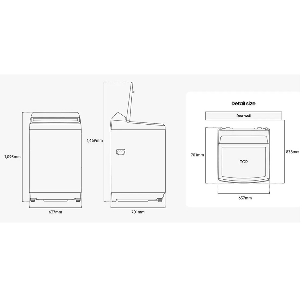 La Samsung Lavadora de Carga Superior 19 kg ofrece un lavado potente y eficiente gracias a tecnologías como Eco Bubble™, BubbleStorm™ y Dual Storm™, que generan burbujas y potentes corrientes de agua para cuidar y limpiar mejor la ropa. Integra un motor Digital Inverter (DIT) de alta durabilidad, silencioso y eficiente, además de funciones inteligentes como Smart Check, reinicio automático y bloqueo para niños. Cuenta con 10 niveles de agua y múltiples programas: ropa de cama, delicados, lavado rápido, enjuagar + centrifugar, super clean, y limpieza ecológica del tambor. Su diseño moderno en blanco con tapa negro caviar de cierre suave (Soft Close Lid), incluye un panel LED intuitivo y filtro Magic Filter.