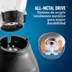 El poderoso motor con alta fuerza de torsión y vaso de vidrio refractario Boroclass® Motor duradero. Acople metálico más fuerte. Vaso de vidrio resistente a un choque térmico de 90°C, que te permite procesar ingredientes hirviendo sin necesidad de esperar a que estos se enfríen. Dos velocidades con pulso alto y bajo. Capacidad de 1.5 litros para preparar desde sopas hasta jugos, salsas y bebidas gratinadas con hielo. Revolucionaria cuchilla trituradora de hielo. Color: Blanco.