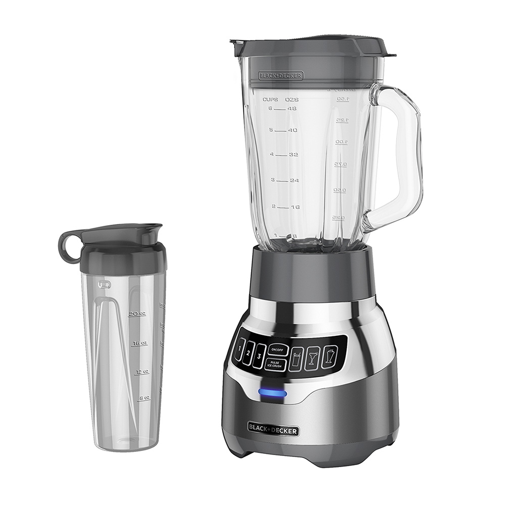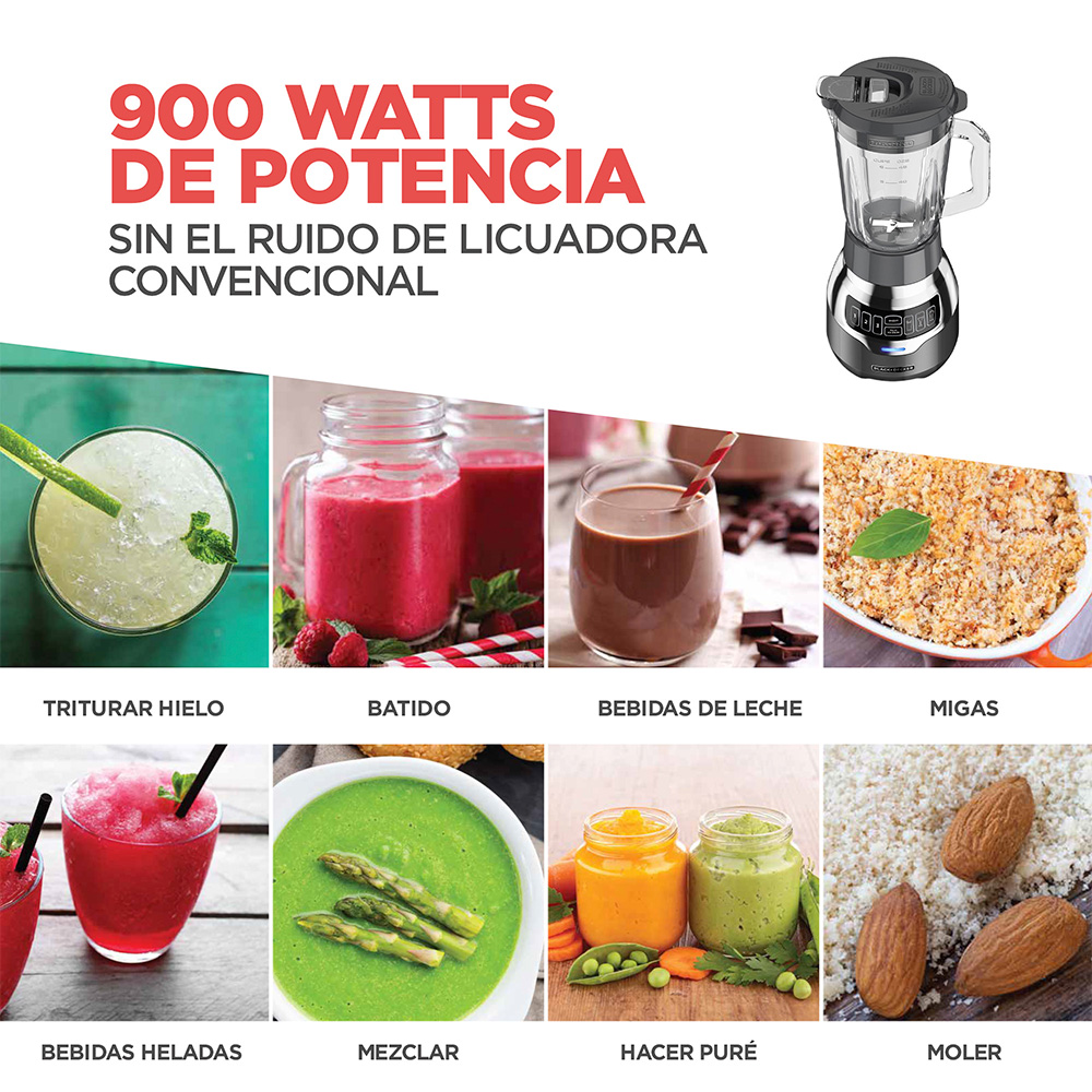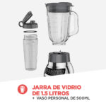 Tecnología de Cuchillas de 4 Puntas QuadPro 900 Watts de Potencia Jarra de Vidrio de 1.5 Litros Tapa de doble abertura Vaso Personal de Tritán de 500 ml con Tapa 3 Velocidades Función de Pulso 3 Funciones Automáticas: Batidos, Bebidas Congeladas y Licuados Controles Digitales Piezas lavables en máquina lavaplatos Pies de goma antideslizantes Guardacable Garantía de 2 años