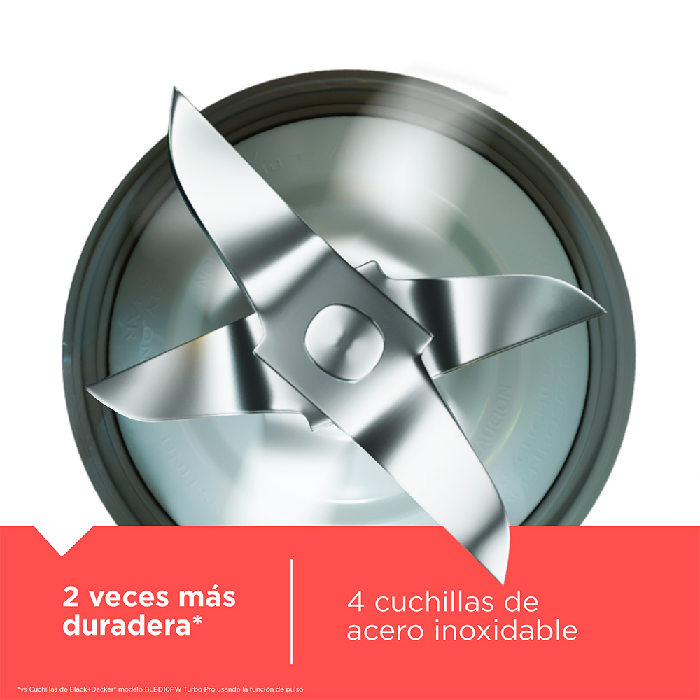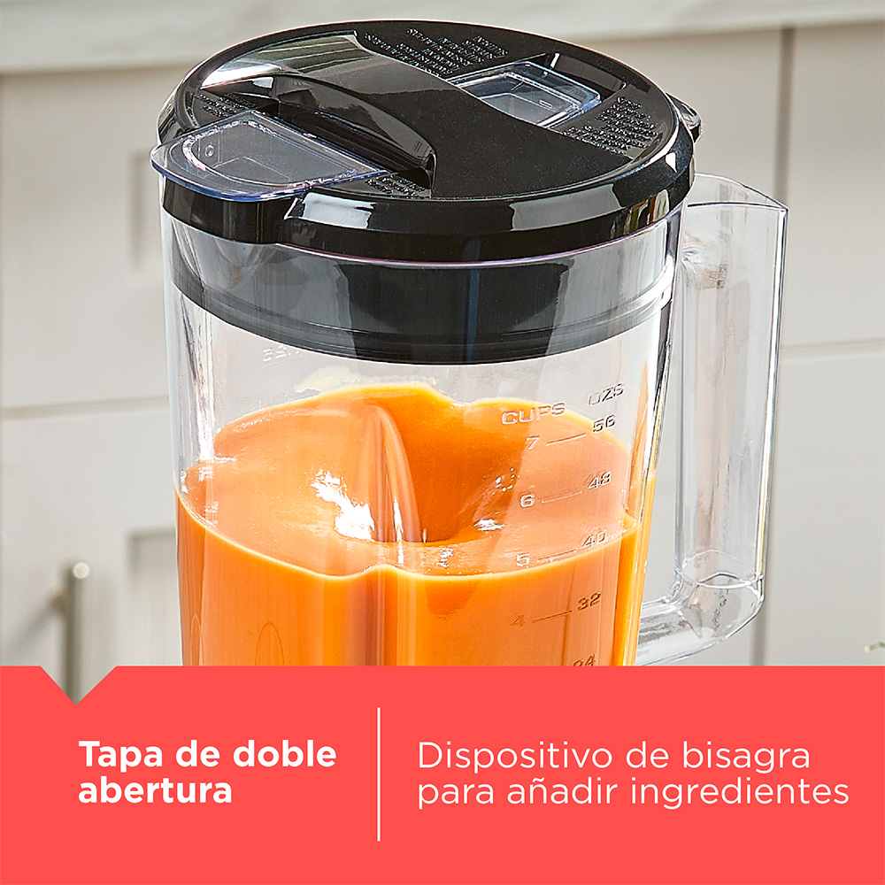 2 veces más duraderas, 4 cuchillas de acero inoxidable 8 velocidades + pulso 700 watts de potencia para triturar hielo Jarra plástica ergonómica de 1.65L Tapa de doble abertura