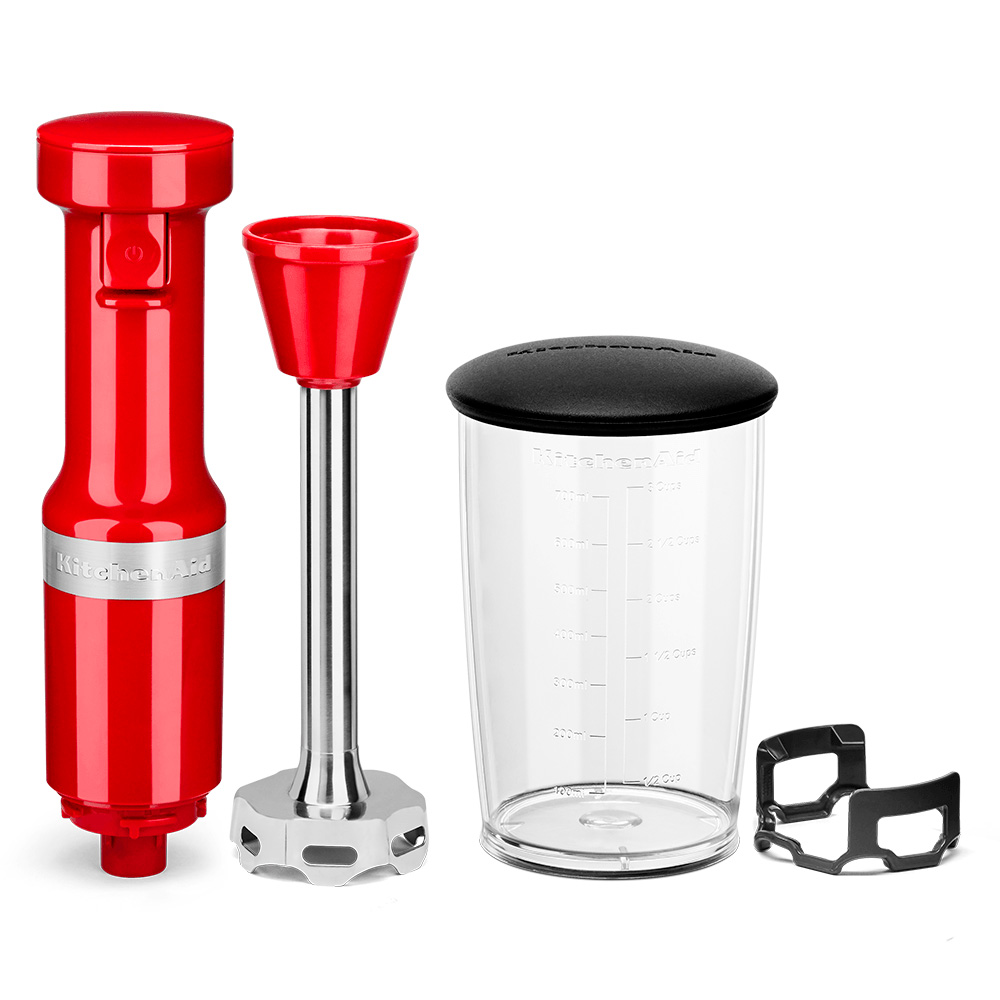 La marca de licuadoras de mano N°1 con diseño duradero, interruptor de gatillo de velocidad variable, protector de sartén extraíble y brazo mezclador de extraíble de 8 pulgadas, incluye un frasco de licuado de 3 tazas libre de BPA con tapa, aptos para el lavavajillas. Crea las deliciosas mezclas, sopas, purés y licuados con toda la potencia de KitchenAid.