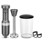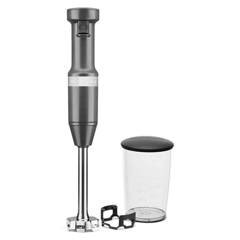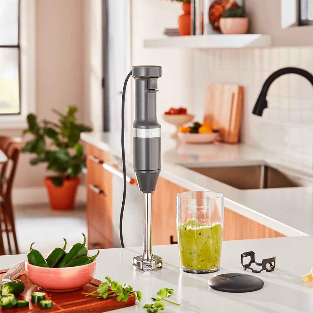 Diseñada para mezclar todo de manera perfecta. Esta licuadora de mano con cable de velocidad variable KitchenAid cuenta con un brazo batidor extraíble de 8 “con cuchilla de acero inoxidable de 4 puntos prepara desde batidos, sopas, salsas y mucho más. Es fácil de usar incluye un protector de sartén de extracción pendiente de patente de EE. UU. para ayudar a proteger sus utensilios de cocina. El frasco de licuado de 3 tazas sin BPA con tapa es ideal para trabajos de licuado individuales, y se puede usar para servir directamente o para almacenar su creación mezclada para un uso posterior. Incluye: Base de la licuadora de inmersión 1 Brazo de mezcla de 8 “(apto para lavavajillas)