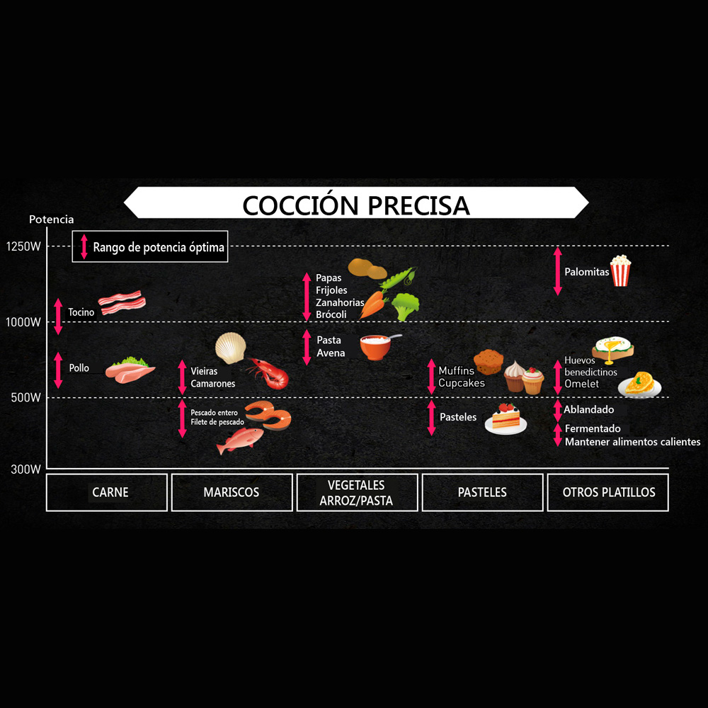 Tecnología Inverter de 27 litros. Cavidad plana y amplia. Preciso control de potencia. Diseño amplio y lineal. Luz de horno LED