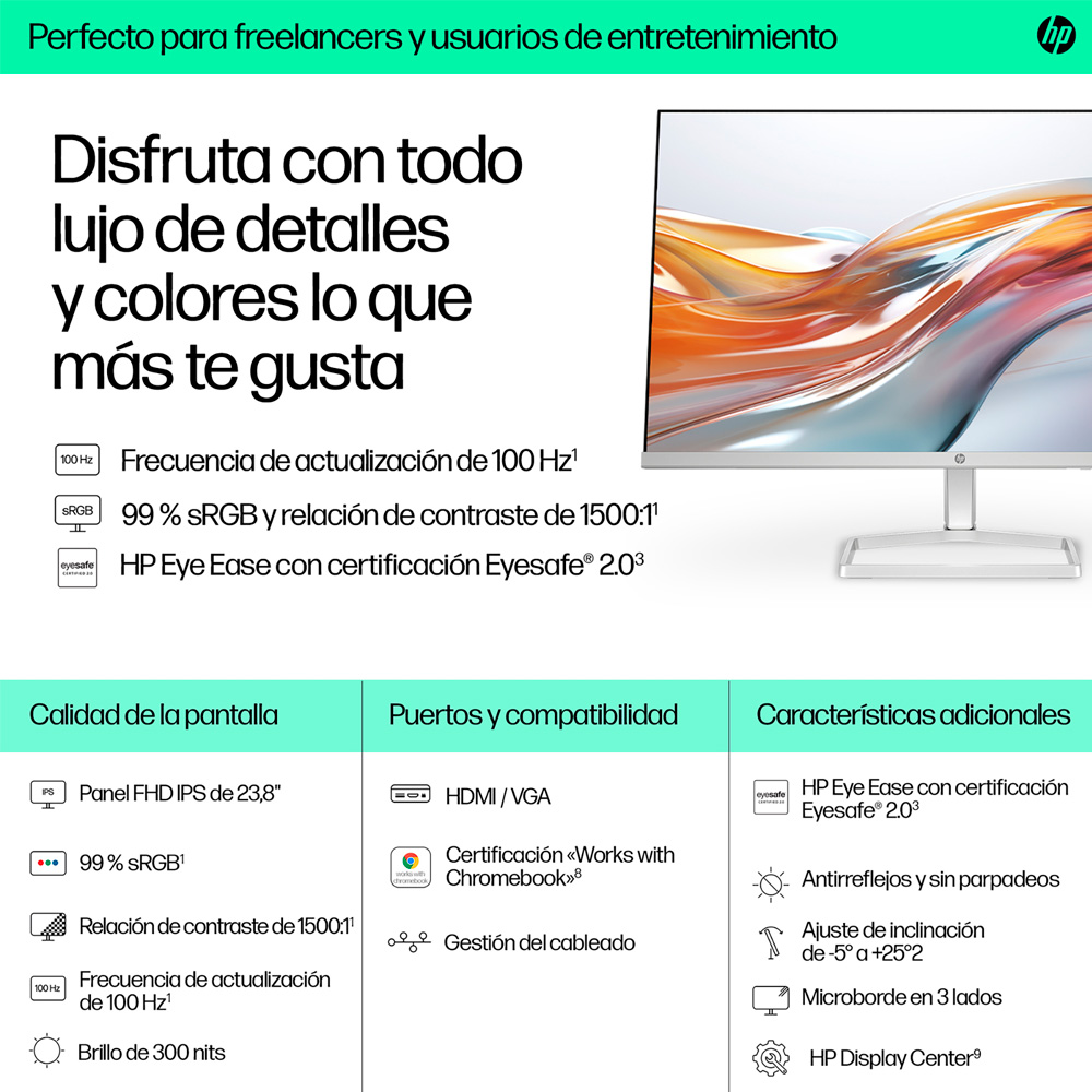 Piérdase en cualquier proyecto que le apasione con el monitor FHD HP de la serie 5 de 23.8 pulgadas y color blanco. Su diseño elegante, fino y liviano le ofrece la flexibilidad necesaria para disfrutar de entretenimiento, mientras que los colores vivos y la relación de contraste profunda le permiten ver todo como debe ser. Mejore su tiempo en pantalla y sus pasatiempos con mayor velocidad de actualización para disfrutar de una experiencia fluida en la pantalla.