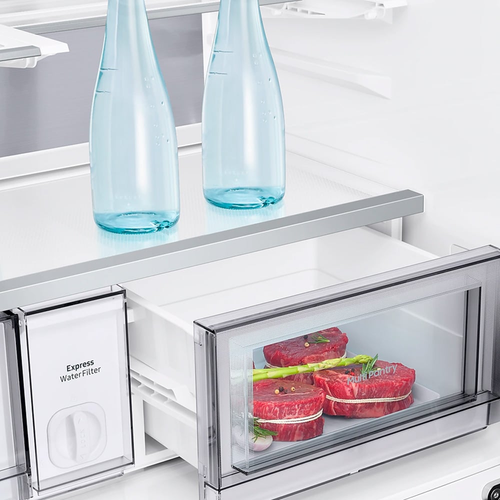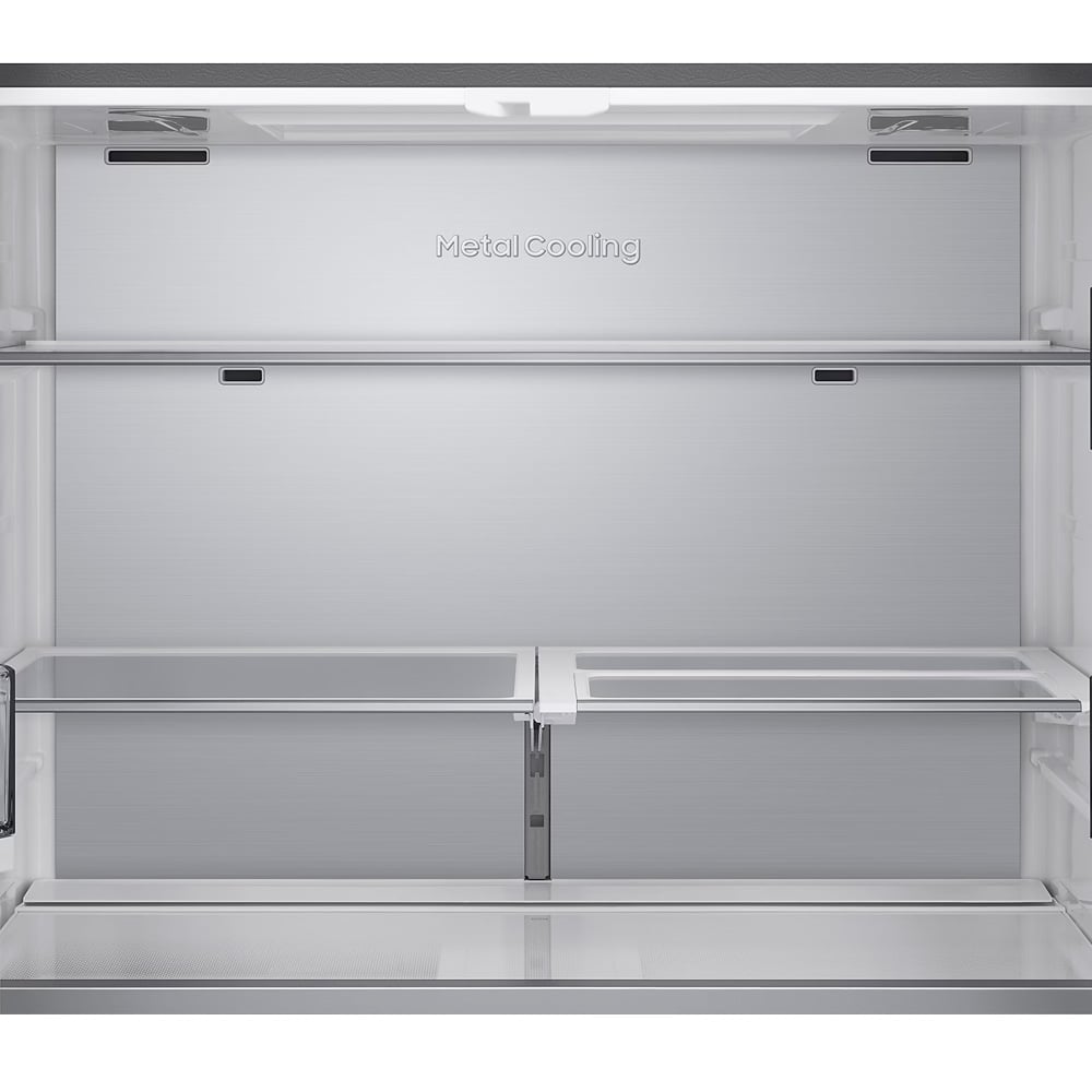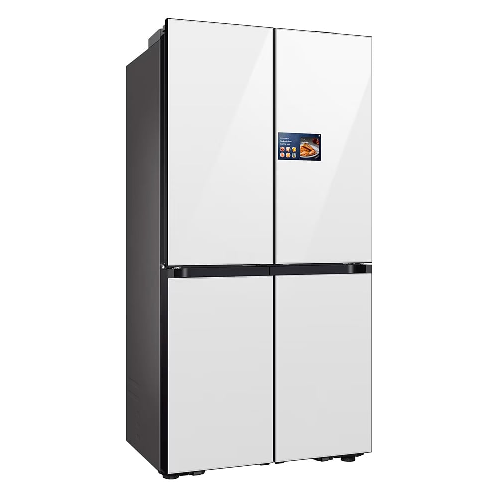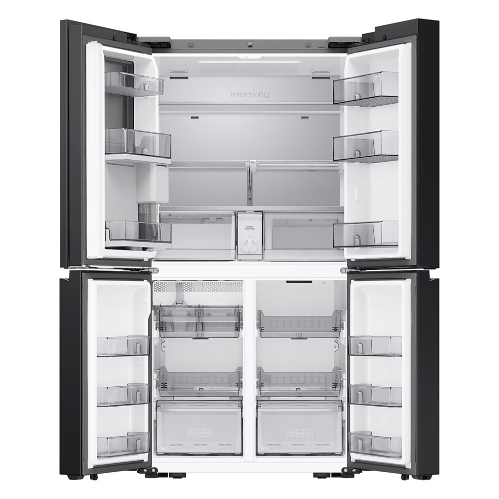 El refrigerador BESPOKE AI Home ofrece una gran capacidad de 657 litros gracias a la tecnología SpaceMax™, que amplía el espacio interior sin aumentar las dimensiones externas. Incorpora AI Hybrid Cooling y Metal Cooling Duct, garantizando una conservación precisa y uniforme de los alimentos. Su diseño elegante con apertura automática de puerta, manijas empotradas y pantalla táctil LCD de 9” combina estilo y funcionalidad. Incluye Beverage Center™ con filtro de agua, doble fábrica de hielo automática, iluminación LED y compartimientos como Multi Pantry para mejor organización. Además, cuenta con Wi-Fi, Bluetooth y compatibilidad con SmartThings y Bixby, para un control inteligente y eficiente.