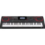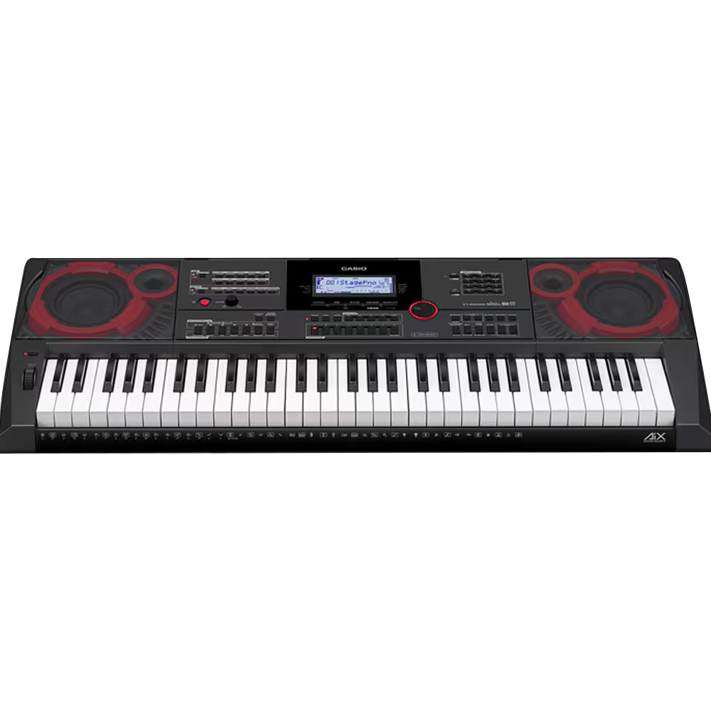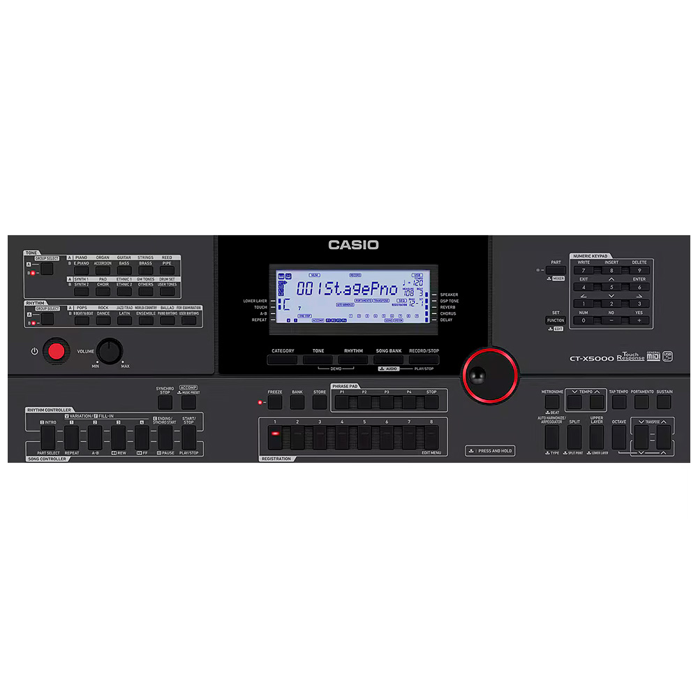 El Casio CT-X5000 representa la versión tope de la serie CT-X, pensado para quienes requieren un instrumento completo y profesional en formato portátil. Su motor sonoro AiX permite reproducir desde un piano de concierto hasta timbres de sintetizador con gran fidelidad, mientras un sistema de amplificación de 30 W con altavoces “bass reflex” brinda potencia adecuada para escenarios pequeños sin necesidad de equipo externo. Incorpora una pantalla retroiluminada que facilita el manejo en ambientes oscuros, controles directos para seleccionar ritmos o sonidos. Además, ofrece conectividad USB-MIDI, entradas y salidas de audio balanceadas, e incluye soporte para tabletas, lo que facilita su integración en estudios digitales o presentaciones modernas.