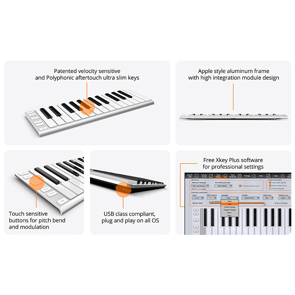 El Xkey 25 AIR es un controlador MIDI Bluetooth ultrafino de 25 teclas. Cuenta con las mismas características profesionales que el Xkey USB original, con la posibilidad de conectarse mediante Bluetooth de baja latencia. Al conectarse inalámbricamente por Bluetooth, el Xkey AIR ofrece más de 10 horas de batería.