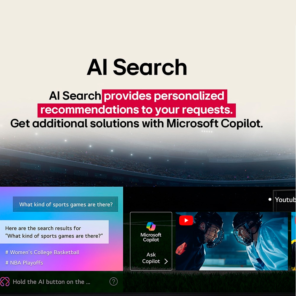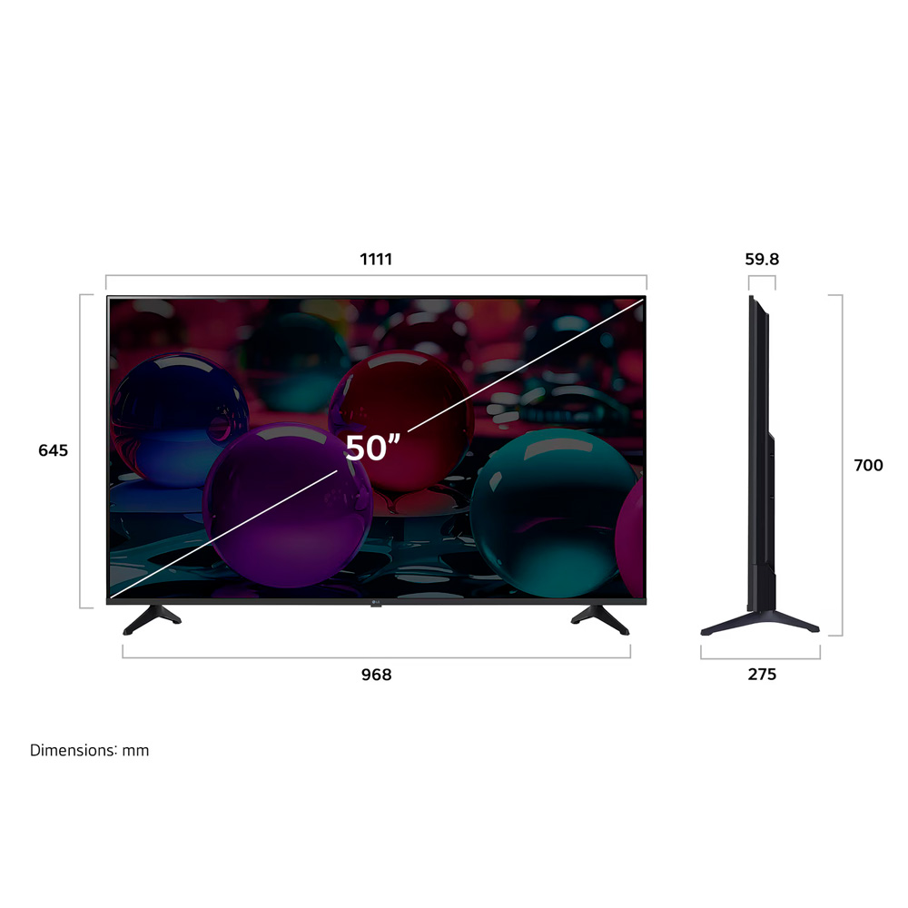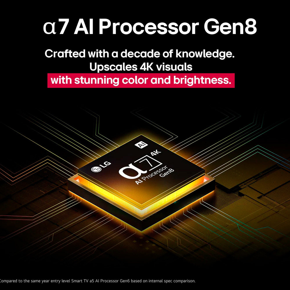 El LG 50UA7300PSB es un Smart TV 4K UHD de 50” impulsado por el procesador α7 AI Processor 4K Gen8, que ofrece imágenes brillantes y sonido envolvente con HDR10 Pro y escalado avanzado 4K. Su plataforma webOS 25 incluye LG Channels con más de 160 canales gratuitos, alertas deportivas, Game Optimizer, Voice ID y control por voz a través del mando Magic Remote. En cuanto a conectividad, está equipado con 3 puertos HDMI (incluido eARC y ALLM), Wi-Fi, Bluetooth 5.1, USB, Ethernet y soporte para Apple AirPlay y Chromecast. Además, trae audio AI Sound Pro de 20 W (virtual 9.1.2) con Clear Voice Pro y compatibilidad con Bluetooth Surround.